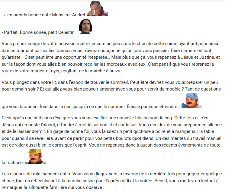 Vous prenez congé de votre nouveau maître, encore un peu sous le choc de cette soirée ayant prit pour ainsi dire un tournant particulier. Jamais vous n’aviez soupçonné qu’un jour vous puissiez faire carrière en tant qu’artiste… C’est peut être une opportunité inespérée… Mais plus que ça, vous repensez à Jésus et Justine, et sur la façon dont vous allez bien pouvoir recoller les morceaux avec eux. C’est pensif que vous reprenez la route de votre modeste foyer, cogitant de la marche à suivre.