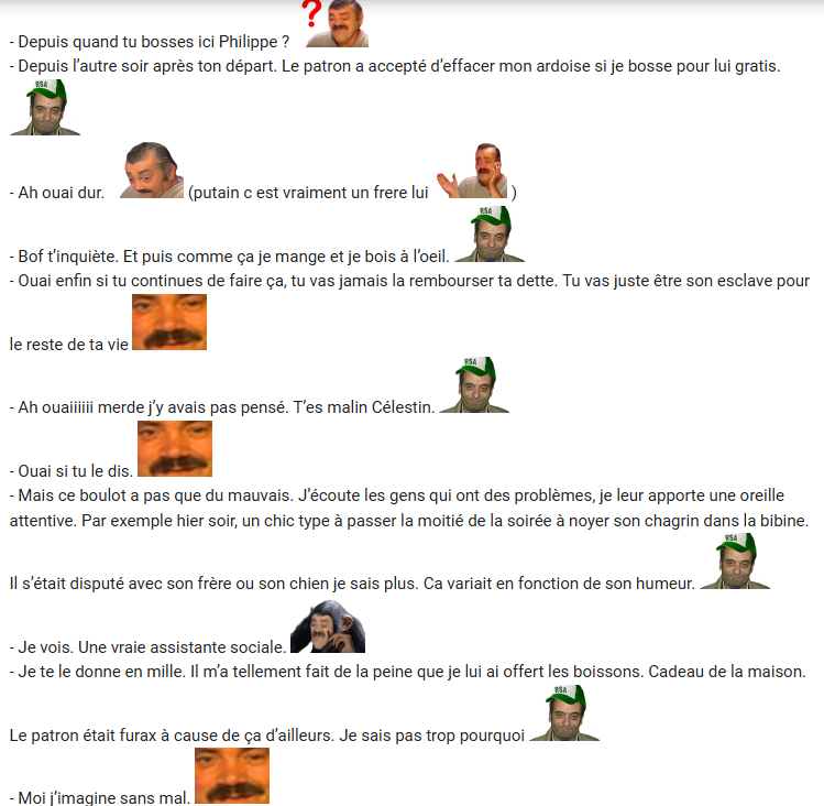 - Mais ce boulot a pas que du mauvais. J’écoute les gens qui ont des problèmes, je leur apporte une oreille attentive. Par exemple hier soir, un chic type à passer la moitié de la soirée à noyer son chagrin dans la bibine. Il s’était disputé avec son frère ou son chien je sais plus. Ca variait en fonction de son humeur.