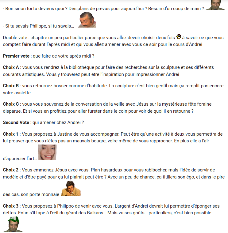 Choix 3 : Vous proposez à Philippo de venir avec vous. L’argent d’Andrei devrait lui permettre d’éponger ses dettes. Enfin s’il tape à l’œil du géant des Balkans… Mais vu ses goûts… particuliers, c’est bien possible.