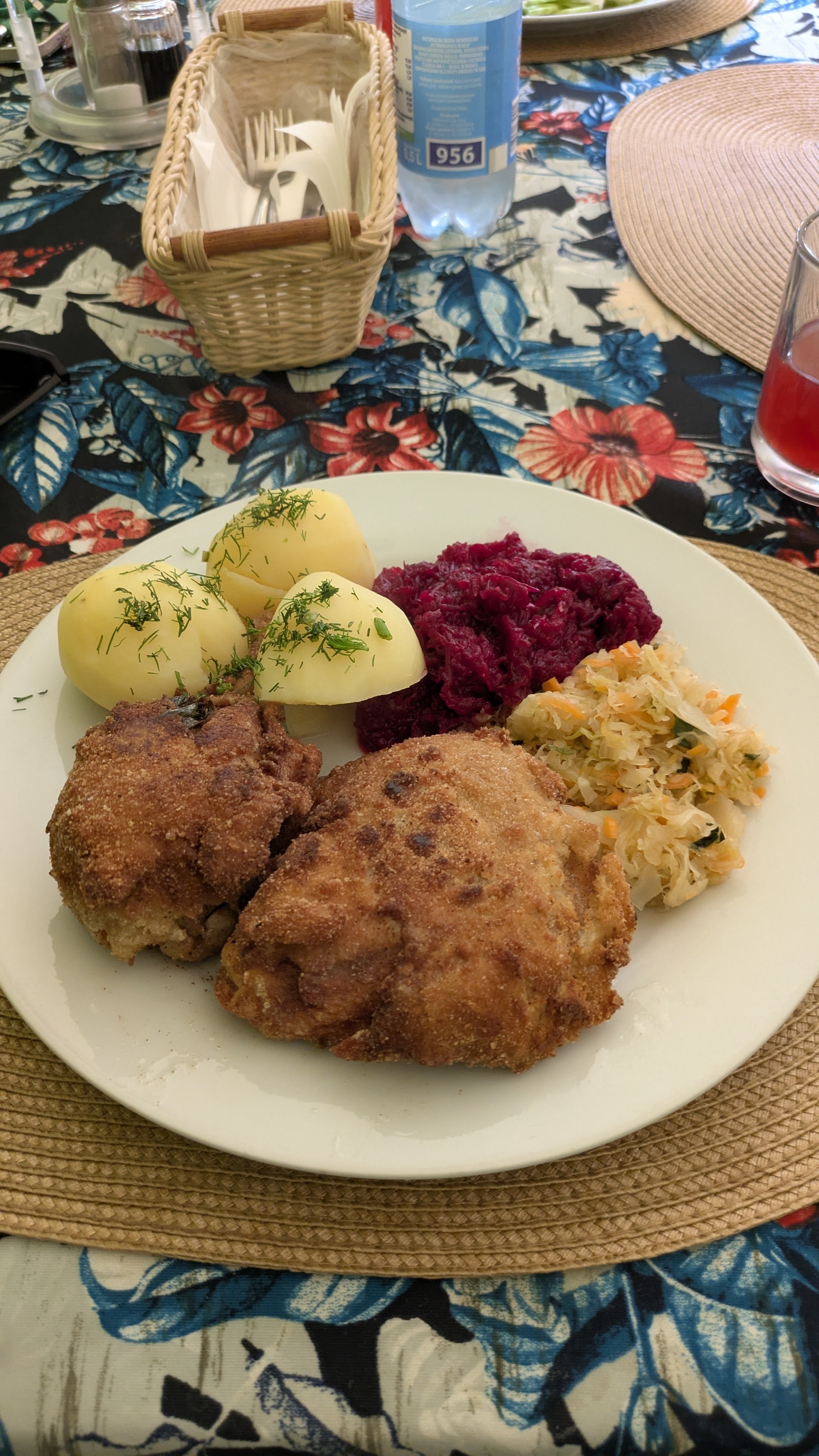Pour 30 zloty (7€) tu a une entrée et le plat. L'entrée c'est une soupe et le plat une escalope de poulet avec des patates et de la betterave.