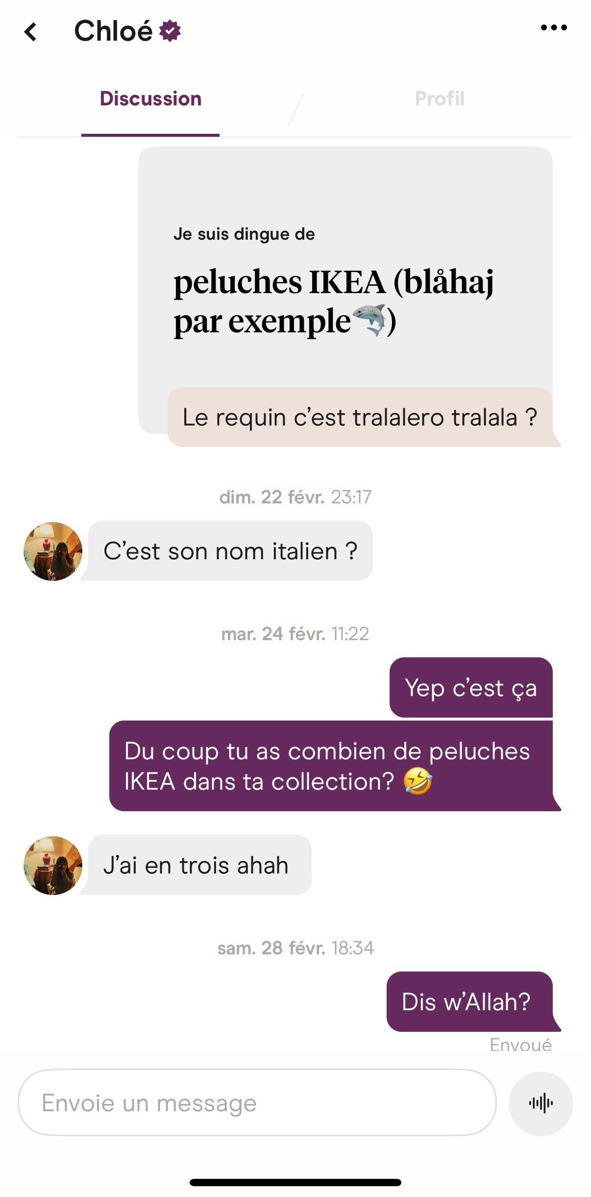 Je pense être pas trop mal en conv, y'en a ça fait 1 mois que je leur parle sur Hinge mais j'ai pas mal la flemme de date ahiT'as converti en baise donc gg khey c'est le principal