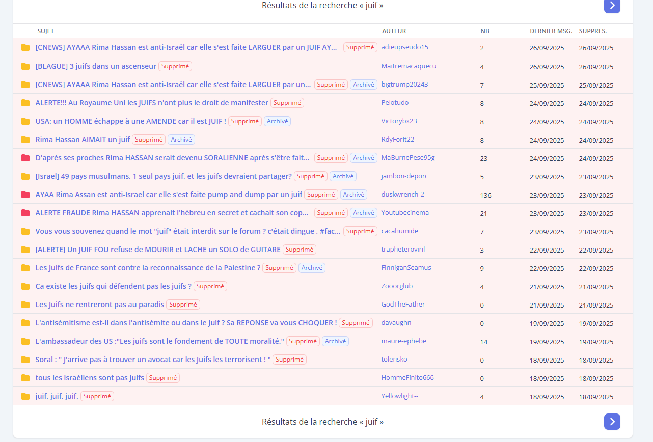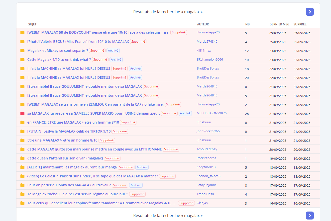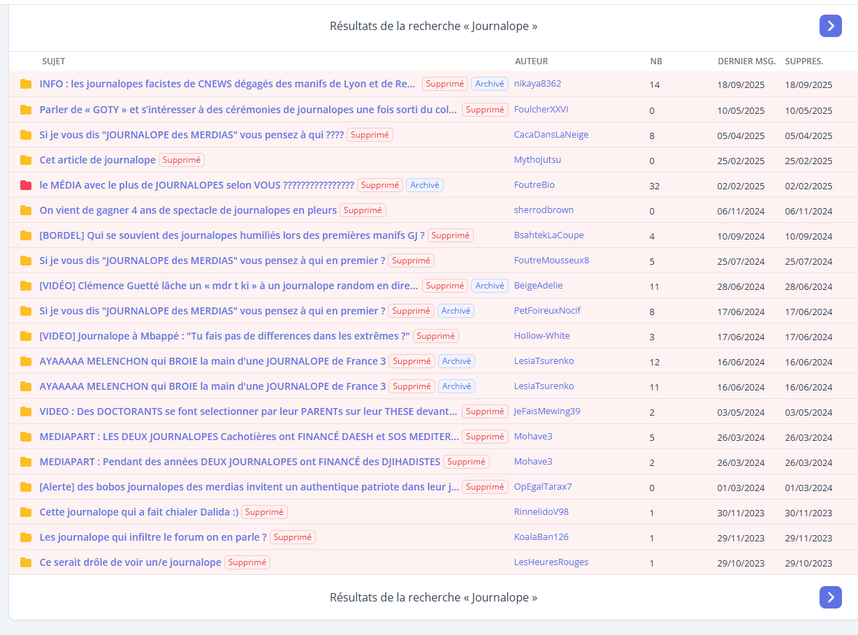 La présence d'un des mots dans le titre d'un topic entrainant sa suppression inévitable peu importe ce dont parle le topic, on voit une liste ininterrompue de 410.