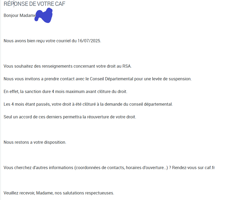 le directeur du CCAS dont il dépend, était aussi au parfum de la situation , également eu au téléphone, pour justement avec assistante sociale, quitte à aller à son domicile l'aider à remplir une demande AAH etc + rétablissement du RSA en attendant d'urgence.