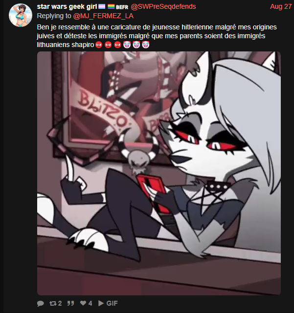 D'ailleurs j'ai remarqué que la plupart des personnes qui utilisent des images tirées de cette série "Hazbin Hotel" sont souvent complètement zinzin et déviants