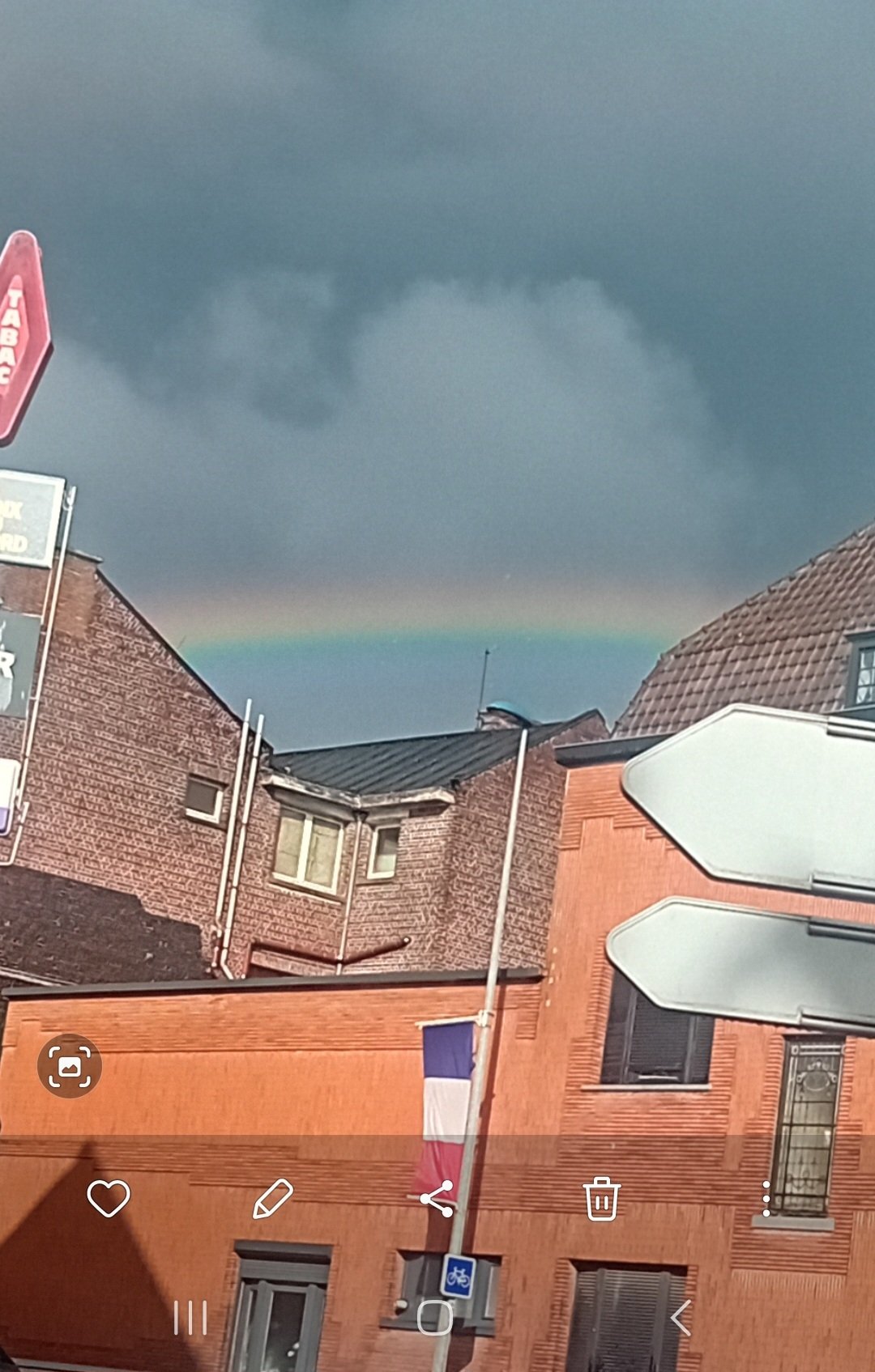 Quel magnifique phénomène météorologique ! En plus je patientais à l'abri, attendant que le déluge passe et je me suis dis "vu le soleil qui arrive il y a moyen qu'il y ait un arc-en-ciel" et bim, je tombe dessus 5min après