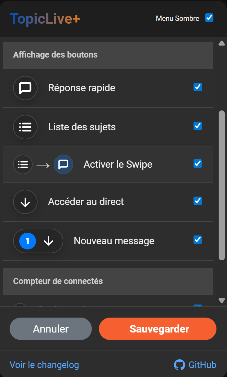 - Mode normal 2 boutons : [Direct/NM] + [Liste des sujets - Swipe vers Réponse rapide]