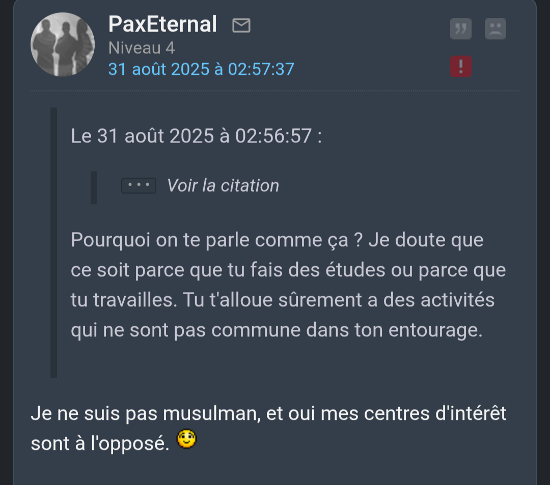 Et donc du coup, tu juges le QI de quelqu'un qui a jamais eu de problème à dire qu'il est algérien d'ethnie kabyle alors que t'es toi même en pleine crise ? _.gif)