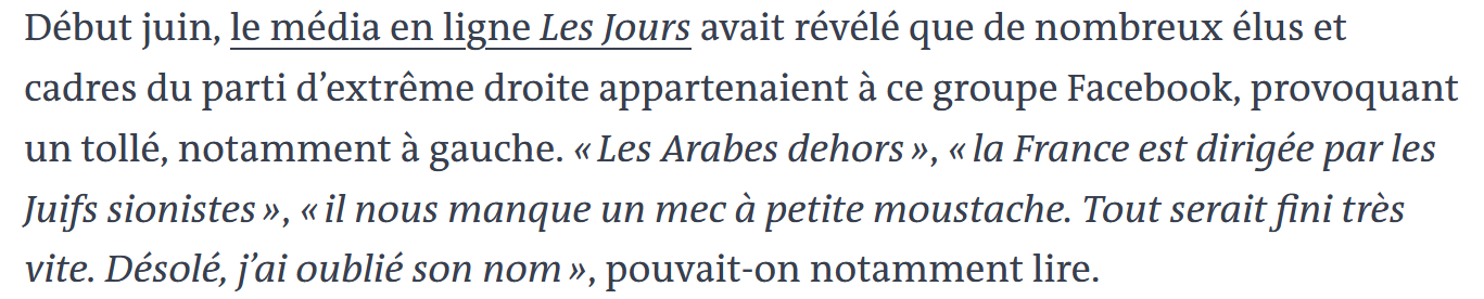 Les arabes dehors », « la France est dirigée par les juifs sionistes », « il nous manque un mec à petite moustache. Tout serait fini très vite. Désolé j'ai oublié son nom », pouvait-on notamment lire, selon Les Jours, sur ce groupe, sans que les responsables du RN - cadres et députés - ne réagissent ou ne modèrent ce type de proposWow un groupe facebook raciste