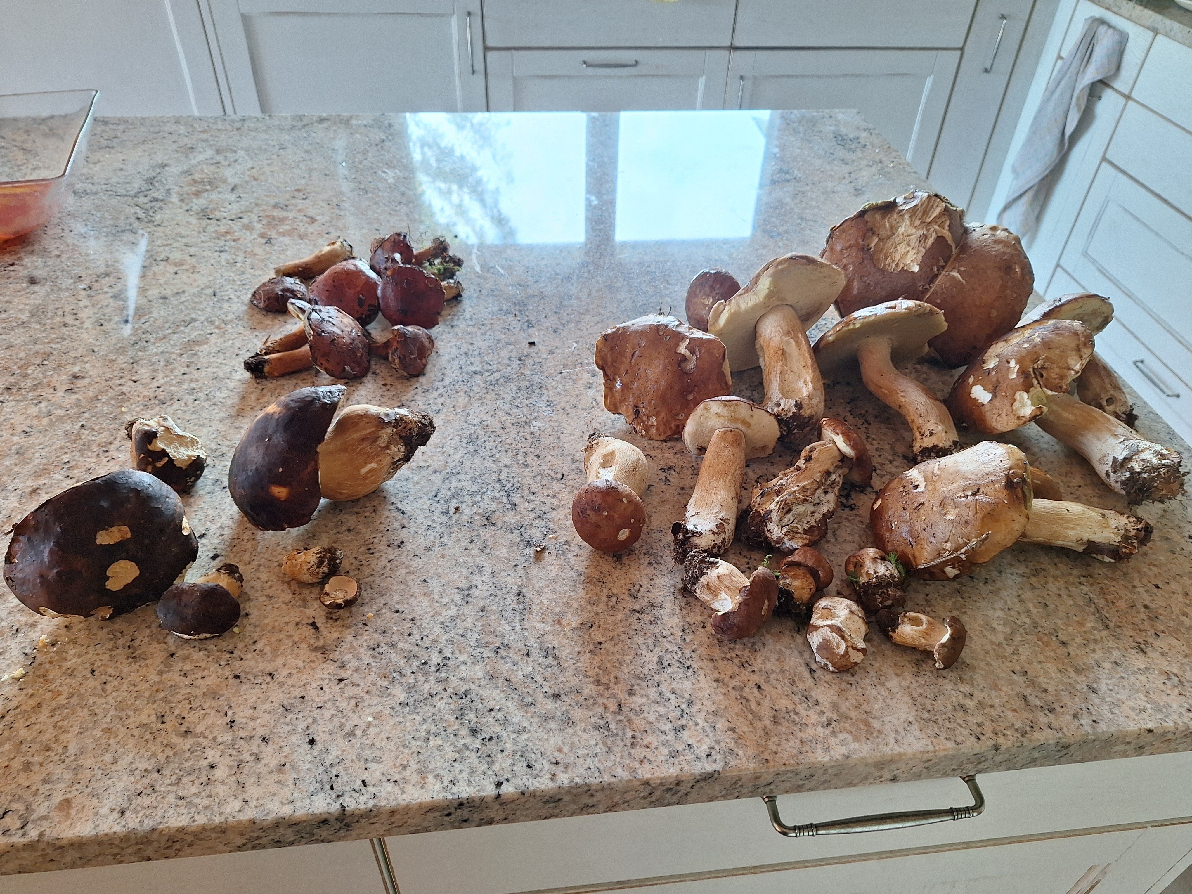 2.1kg de champignoufs ; cèpes de Bordeaux à droite, cèpes à tête noire à gauche, bolets bais en haut à gauche, Finistère sud