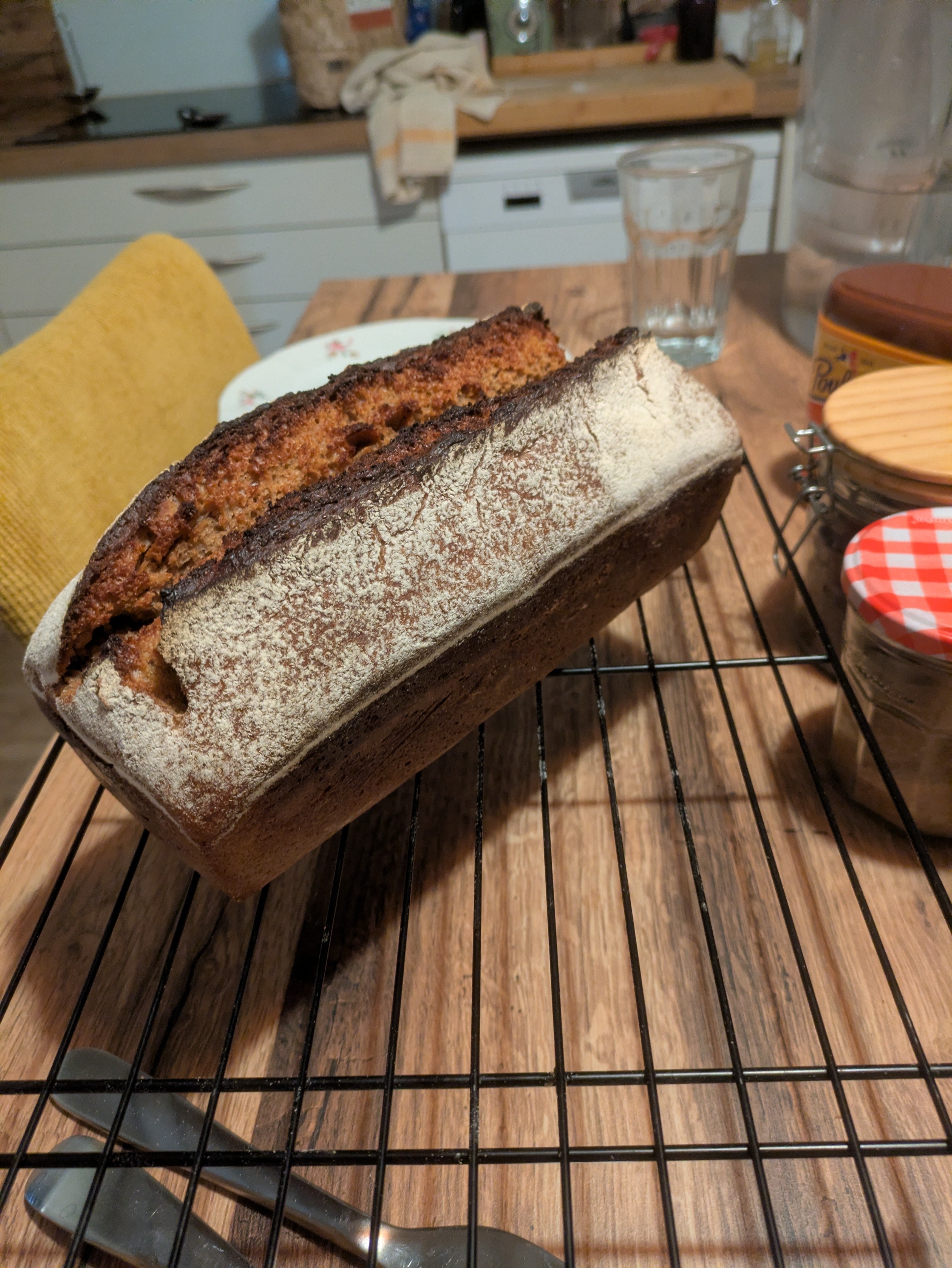 80% de seigle, 20 % de froment et levain dure. C'est très bon le matin au pdj, ou en tartines avec de l'avocat
