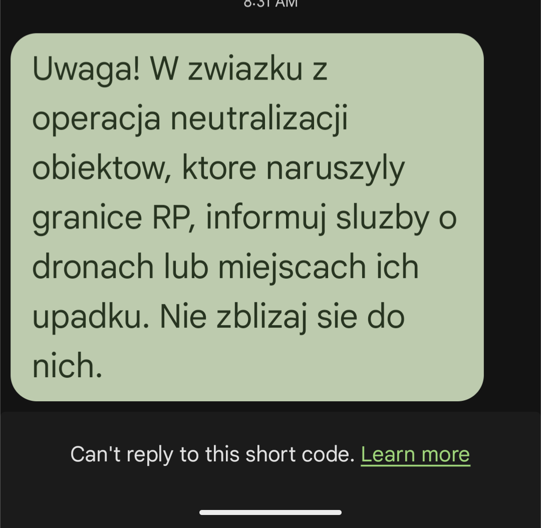 Attention ! Dans le cadre de l'opération de neutralisation des objets ayant violé les frontières de la République de Pologne, veuillez signaler aux services la présence de drones ou le lieu de leur crash. Ne vous en approchez pas.