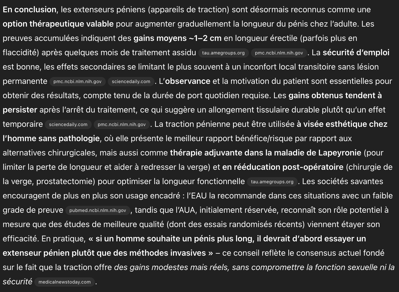 C’est pour cette raison que les études cliniques montrent des résultats cohérents : après 3 à 6 mois d’utilisation régulière (4 à 9 heures par jour), les extendeurs permettent un gain moyen de 1 à 2 cm en érection, avec des effets qui se maintiennent à long terme. En résumé, l’extenseur marche parce qu’il repose sur un mécanisme biologique universel l’adaptation des tissus soumis à une traction prolongée ce qui en fait la seule méthode non chirurgicale documentée scientifiquement comme efficace pour augmenter la longueur du pénis."