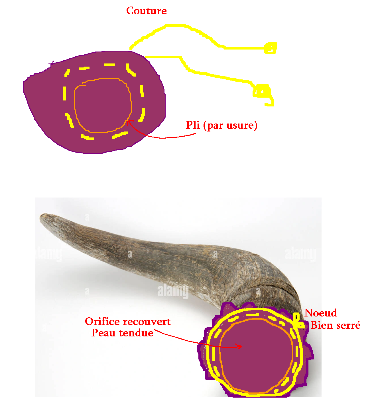 Sinon il faudrait utiliser de la peau tannée ainsi que de la ficelle pour faire un capuchon refermable (on noue bien la peau autour de l'extrémité).