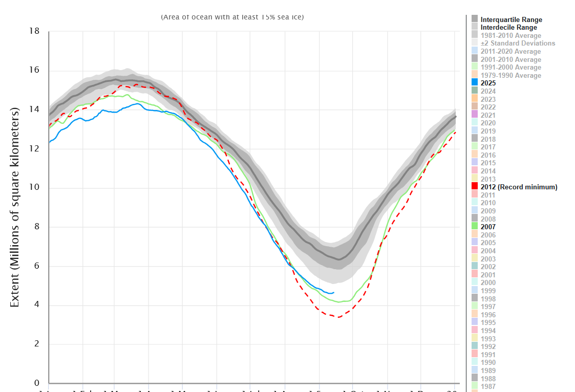 D'apres le NSDIC, donc les satellites de la Nasa 'lien ci dessous + image la banquise arctique en 2025 a une étendue supérieure de 1,2 millions de km2 par rapport à 2012 et 300 000 km2 de + par rapport à 2007 :