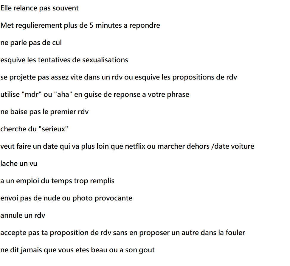 Ok Hitch l'expert en seduction, ta liste pue la merde, des le 2eme point y a un probleme "met regulierement plus de 5 minutes à repondre" t'es le genre à te sentir delaissé parce qu'une meuf ne te repond dans la minute c'est chaud, tu crois que toutes les meufs sont à ton service pour te repondre instant ?