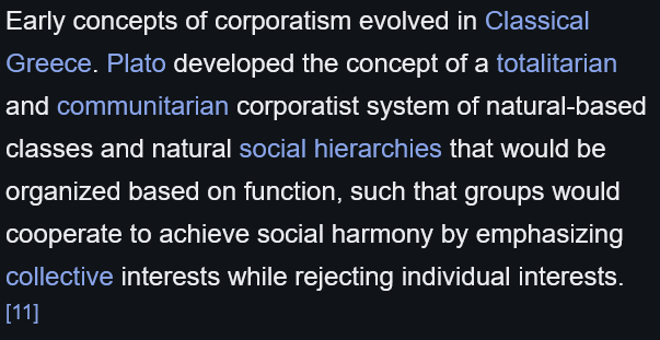 Platon a développé le concept d'un système corporatiste totalitaire et communautaire de classes fondées sur la nature et de hiérarchies sociales naturelles qui seraient organisées selon la fonction, de telle sorte que les groupes coopéreraient pour parvenir à l'harmonie sociale en mettant l'accent sur les intérêts collectifs tout en rejetant les intérêts individuels.