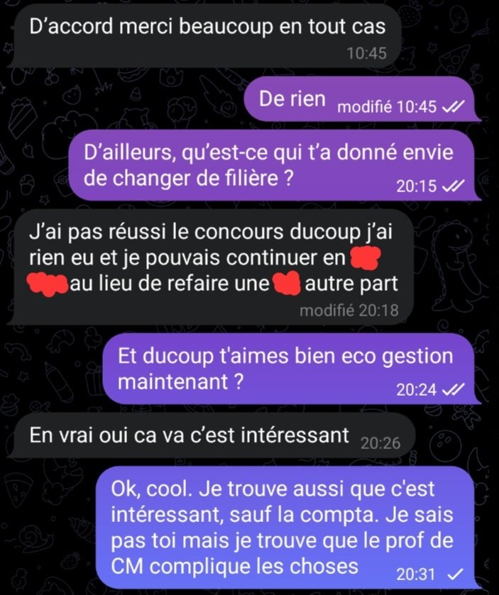 Non, je l'ai juste aidé sur un truc et ducoup apres ca jai tenté de continuer à parler mais apparemment elle veut pas. À croire que je suis son chien, je l'aide et elle n'a meme pas la gentillesse de repondre