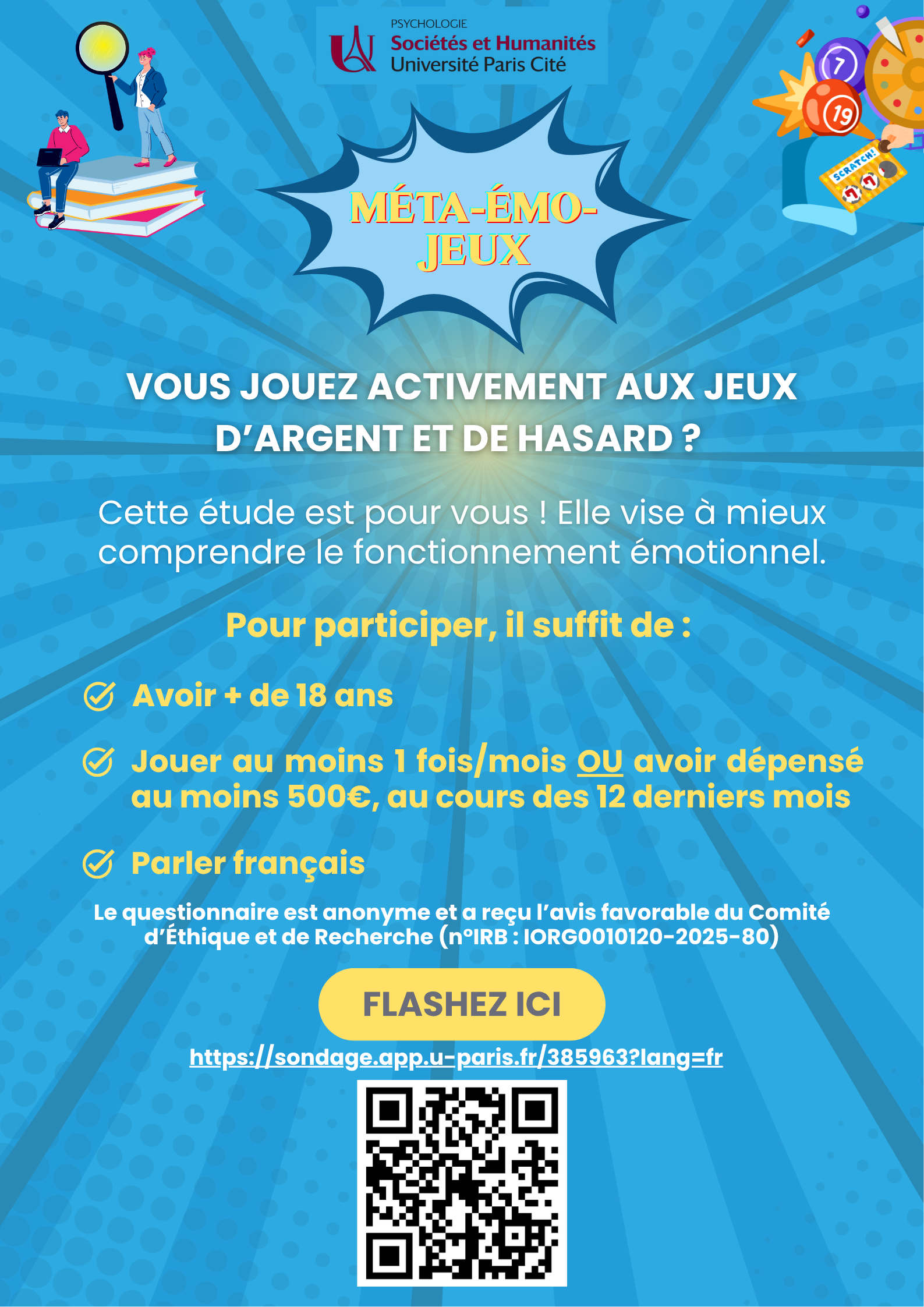 Je rĂ©alise une Ă©tude sur les jeux dâargent et de hasard (jeux de tirage, poker, machines Ă sous, jeux de grattage, blackjack, paris sportifs...) dans le cadre de mon Master 2 Ă l'UniversitĂ© Paris CitĂ©. Elle vise Ă mieux comprendre le fonctionnement Ă©motionnel des joueuses/joueurs.