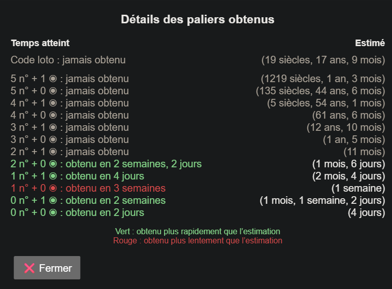 Elle indique pour chaque palier le nombre moyen de tirages attendu, calculé à partir des probabilités et de vos résultats