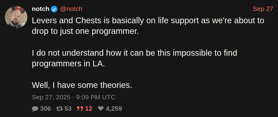 Ici, Notch se plaint de ne pas trouver de dev à Los Angeles pour son JV actuellement en développement.