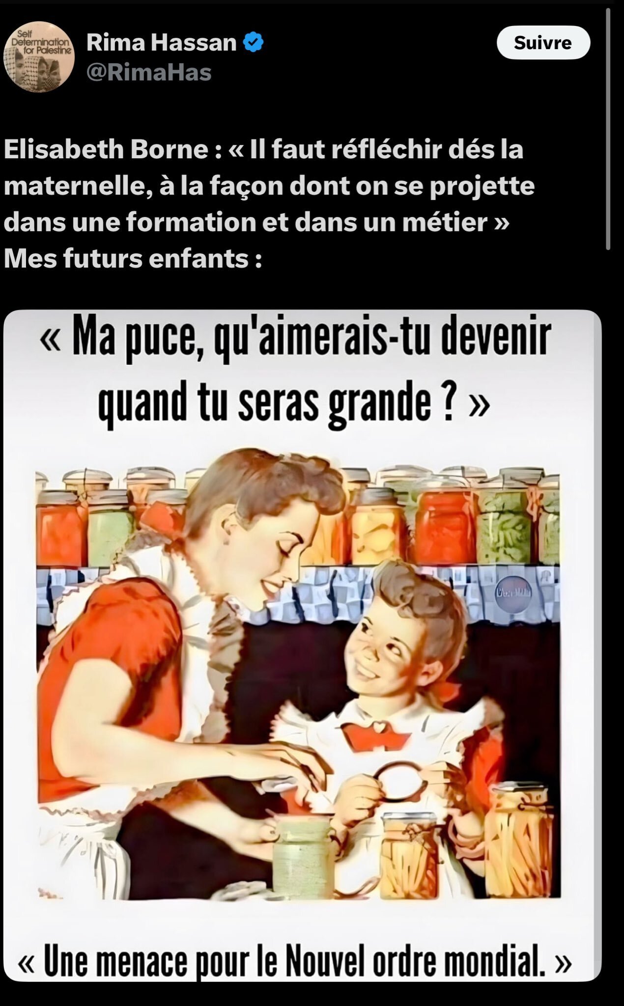Il est plus ou moins évident qu'il s'agit d'un simple shitpost et que je n'attends absolument rien de l'arabo-socialiste Rima Hassan, si ce n'est son retour en Palestine occupée.