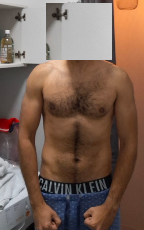 Je pèse 102kg pour 1m82, j’ai à mon avis à peu près 15kg à perdre au moins pour que ma masse musculaire soit visible. Mais même avec ce poids, j’ai quelques muscles qui ressort comme ceux des bras.