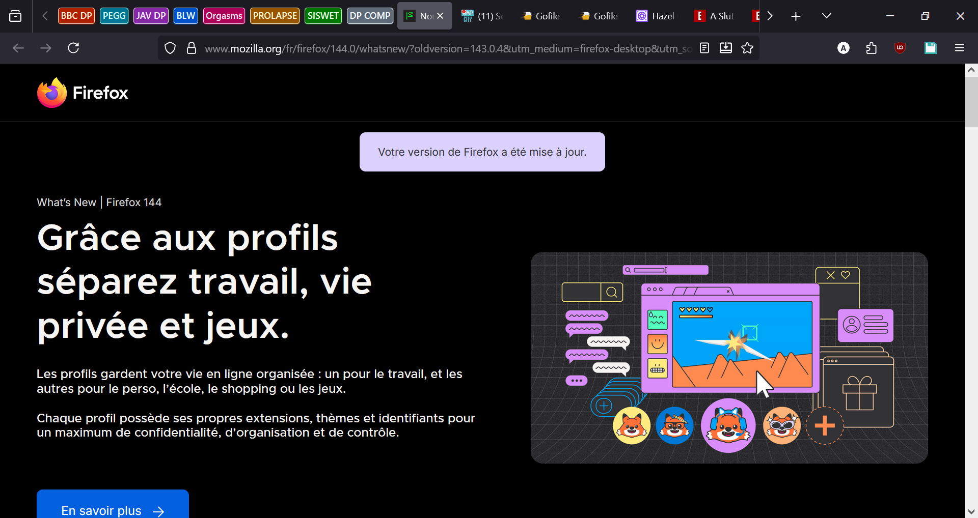 Y'a une partie de moi qui reste attaché au pr0n nonobstant, chaque jour je check les nouveautés que j'ai organisées en plusieurs containers via Firefox, avec des centaines d'onglets par container (les trucs en couleur là) mais j'arrive pas à les regarder car ZERO LIBIDO, JE SUIS LIBRE! Preuve:
