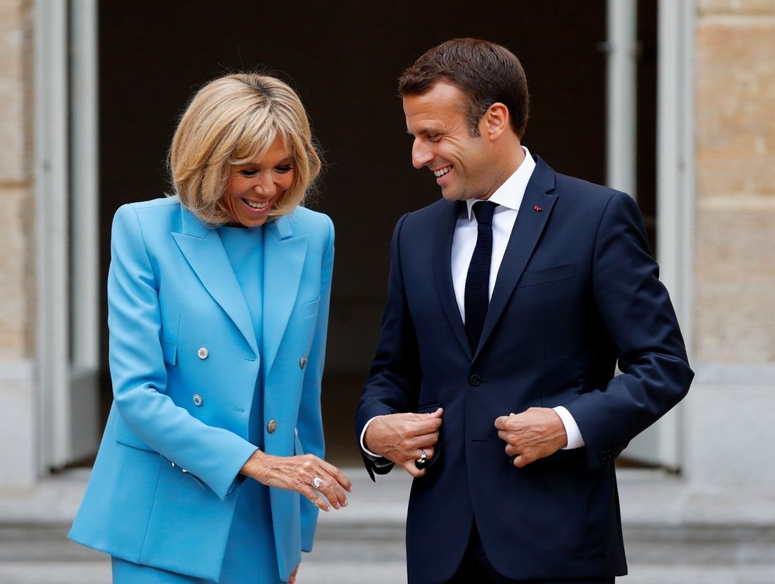 Brigitte Macron qui regarde dans son pantalon en souriant, Macron à côté qui rigole et regarde également en mimant quelque chose de gros et d'imposant avec ses mains