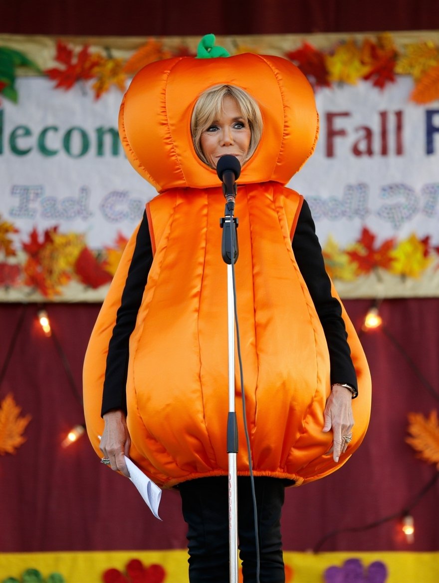 Prompt (sans enhancing de prompt, sinon ca capote) : Brigitte Macron smiling as she looks down at his pants, Macron standing next to her laughing and also looking down, miming something big and imposing with his hands.
