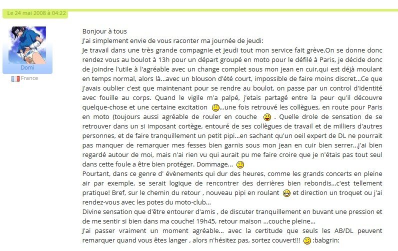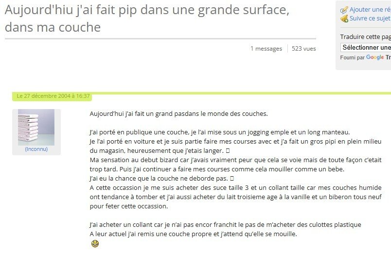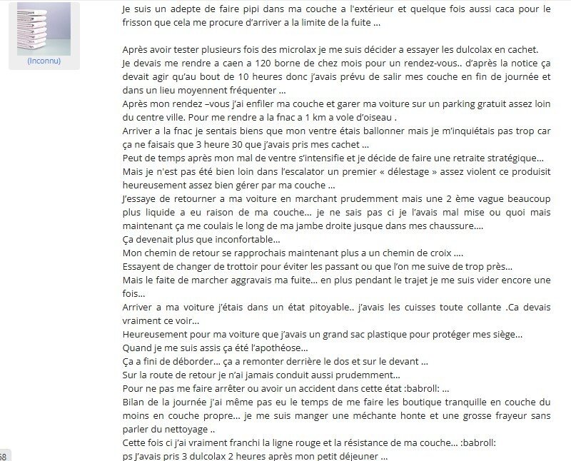 Puis je l'invite à aller manger en ville, à peine dehors il me dit devoir continuer à pisser, je lui impose donc de faire tout en marchant par petits jets pour laisser le temps à la couche d'absorber. Quand il a terminé il me dit que c'est la première fois en public, que c'est agréable surtout en pensant à tout ce monde croisé qui ne s'imagine pas ce qu'il fait.![]()