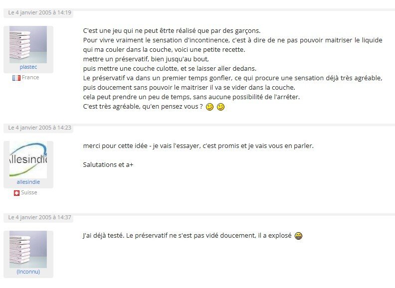 Je lui avais demandé de ne pas faire pipi avant mon arrivée aussi après avoir bien discuté pour le rassurer et bu quelques cafés il me dit devoir faire pipi urgent, je lui explique que depuis mon arrivée j' ai déjà fait une fois dans ma couche et lui prouve, lui n' en pouvant plus a lâché plusieurs jets qui auréolent le devant de son pantalon clair. Comme il est timide et gêné sans lui demander j' ouvre et baisse son pantalon puis retire son slip trempé, le fait allongé par terre pour lui mettre sa couche et culotte plastique et lui demande de mettre un pantalon sombre.![]()