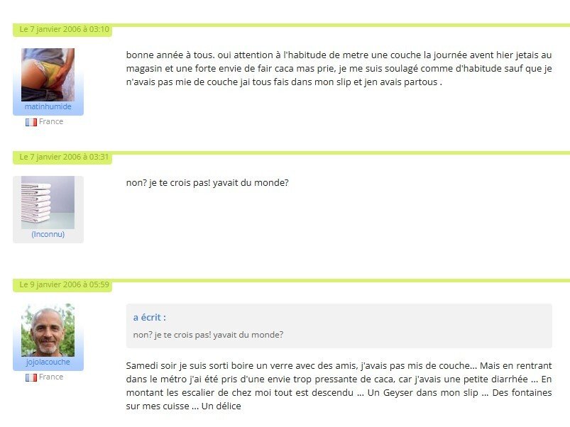Chez lui nous retirons nos pantalons pour voir notre état et nous caresser mutuellement en malaxant le tout par dessus culotte et couches puis en glissant nos mains dedans, c'est alors qu'il se rend compte qu'en plus de la nourriture j'ai fait caca dans ma couche et qui en a plein la main.![]()