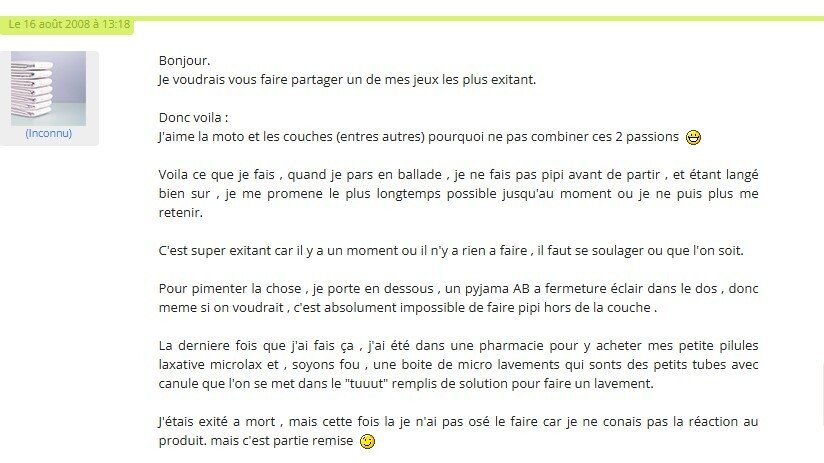 Rendez-vous pris pour aller en fin de matinée chez lui, je suis équipé comme chaque jour d'un change complet et culotte plastique et j' ai dans mon sac le même pour lui.![]()