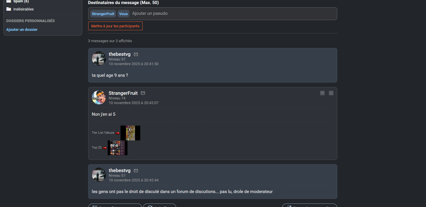 je veux discuté au modération ou à un admin par rapport à ce forum, qui kick les gens qui sont pas hors charte, mais qui kicke arbitrairement les gens qu'il les derranges