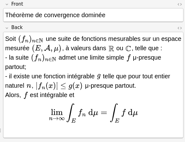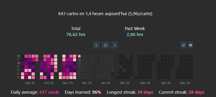 J'ai repris il y a 3 mois avec quelques anciennes cartes qui me paraissent toujours pertinentes + de nouvelles que j'ajoute. Il faut largement que j'en ajoute plus et cela régulièrement car là je m'ennuie. Je vais voir pour réintroduire mes anciennes cartes au fur et à mesure mais j'ai une énorme flemme (cartes de l'époque où je tryhardais les maths, full théorèmes et formules de dérivation et autre outils à savoir par coeur pour être un monstre). Je regrette de pas avoir continué Anki après les études mais en vrai en relisant ça fait plaisir car je me souvient globalement de tout (grâce au tryhard de l'époque), je peux encore récolter les bénéfices si je réintroduis ces cartes.ahi pareil j'ai 21000 cartes de l'époque dont 17000 inédites j'essaye d'introduire petit à petit