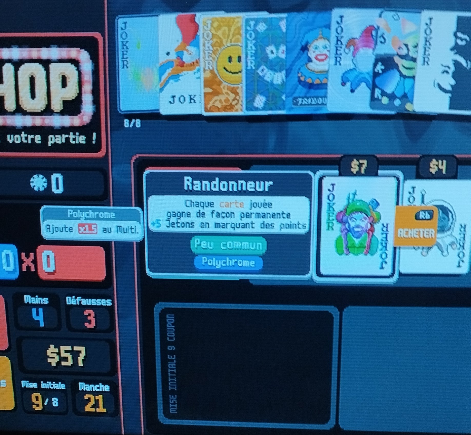 Après 10h de jeu jsuis en train de faire ma meilleure partie. J'ai enfin fini une run et je suis en mode infini. Mais là j'ai un choix à faire. Est-ce que j'enlève mon joker abstrait qui me confère +24 en multiplicateur pour mettre un randonneur polychrome ? Je fais quoi les clés