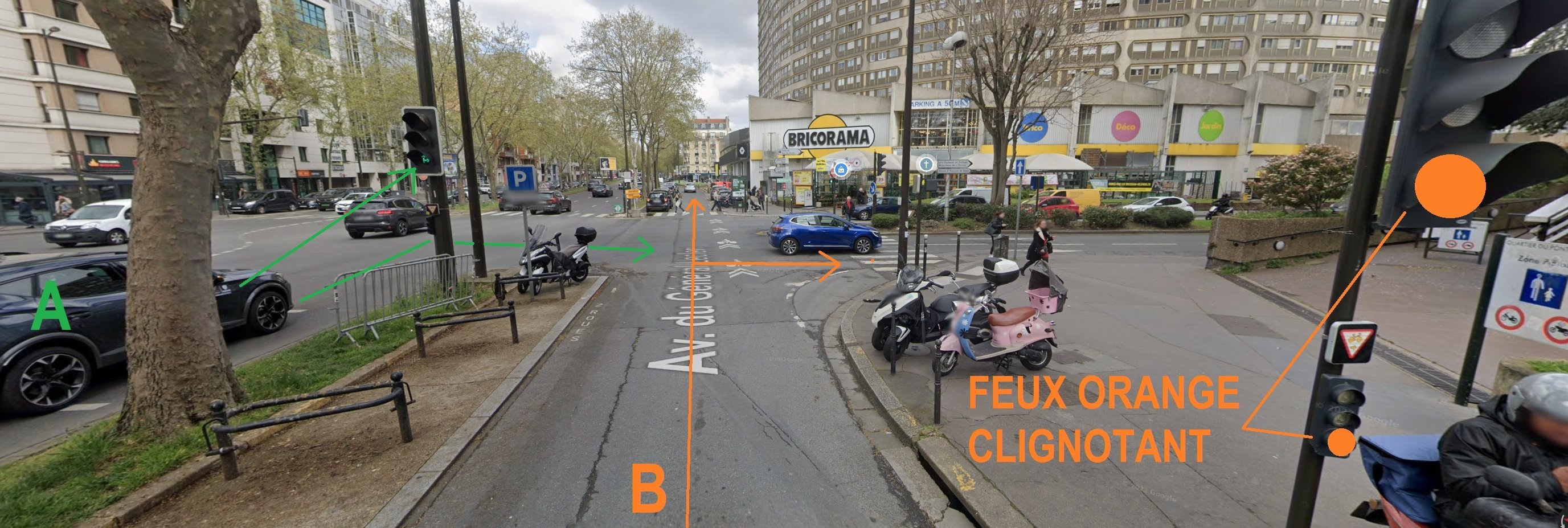 Le véhicule A qui souhaite tourner a droite (Feu vert) ou le véhicule B (Feu orange clignotant) ?