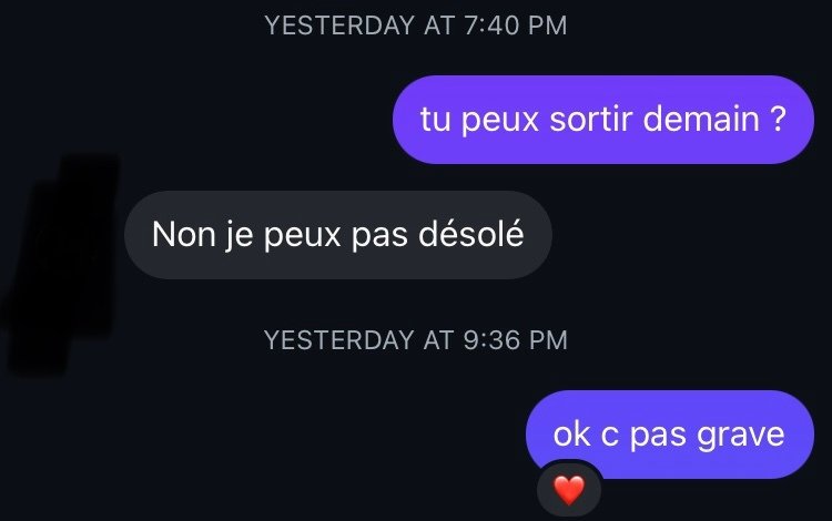 Le 15 novembre 2025 à 16:02:41 : Putain mais tu veux qu'on te dise quoi ???? C'est juste quelqu'un qui te dit " je ne suis pas dispo ". Ca peut être vrai ou elle peut en avoir rien à foutre de ta gueule, comment tu veux qu'on le sache ?