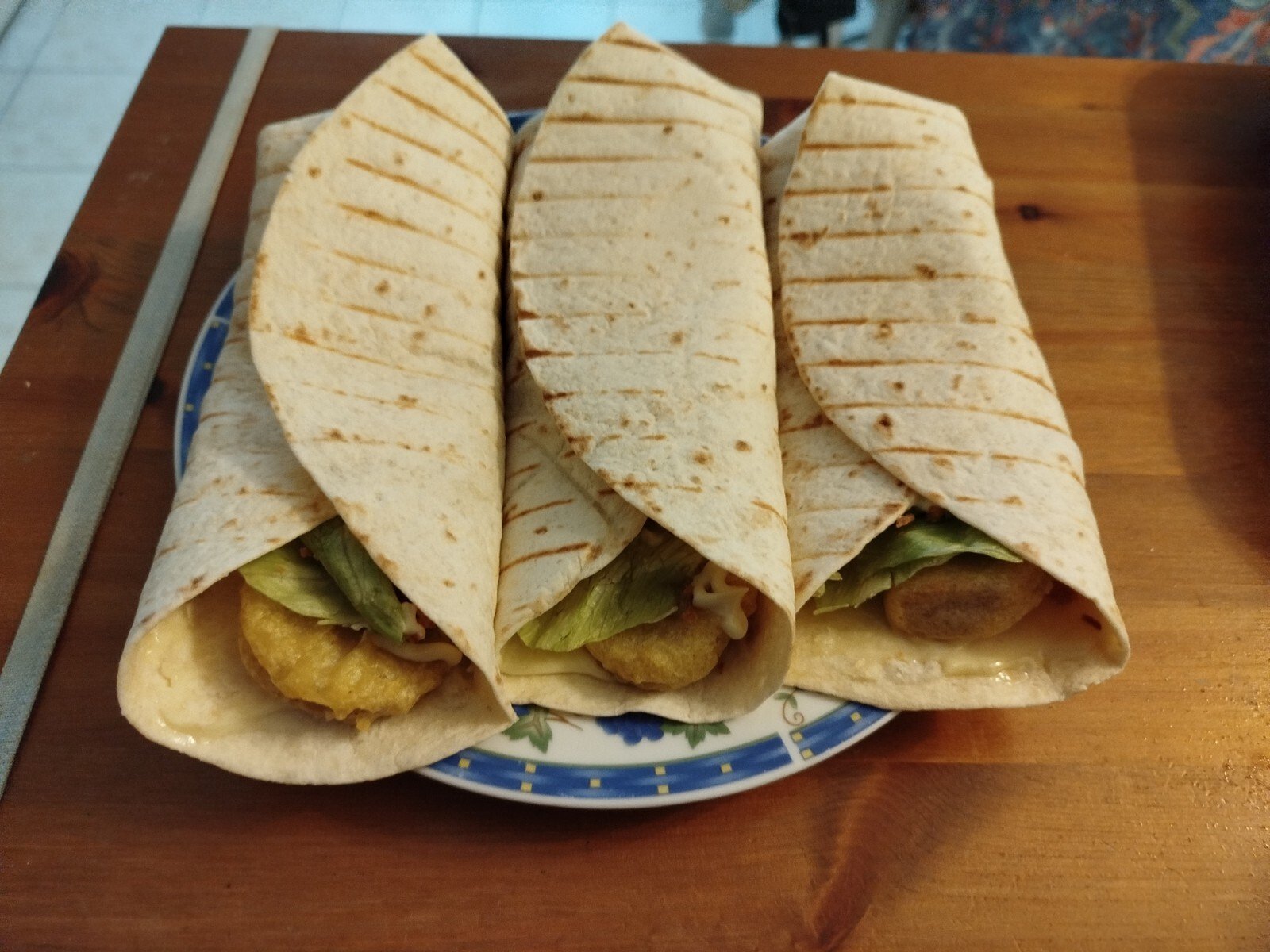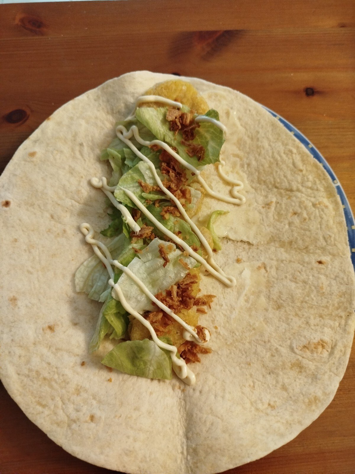 Fromage, nuggets de poulet, salade, oignons frits, mayonnaise