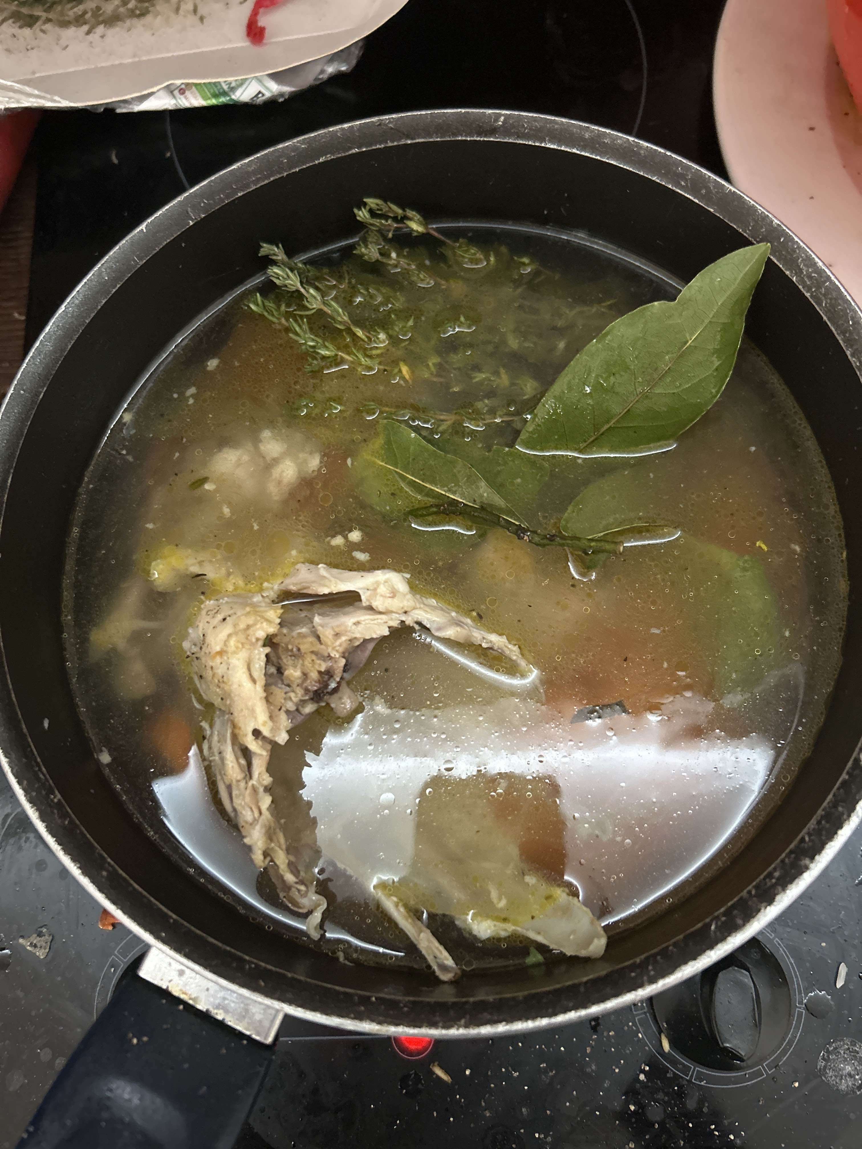 Une carcasse de poulet4 carottes coupées en rondelles de 1 cmThym, laurierSel, poivre