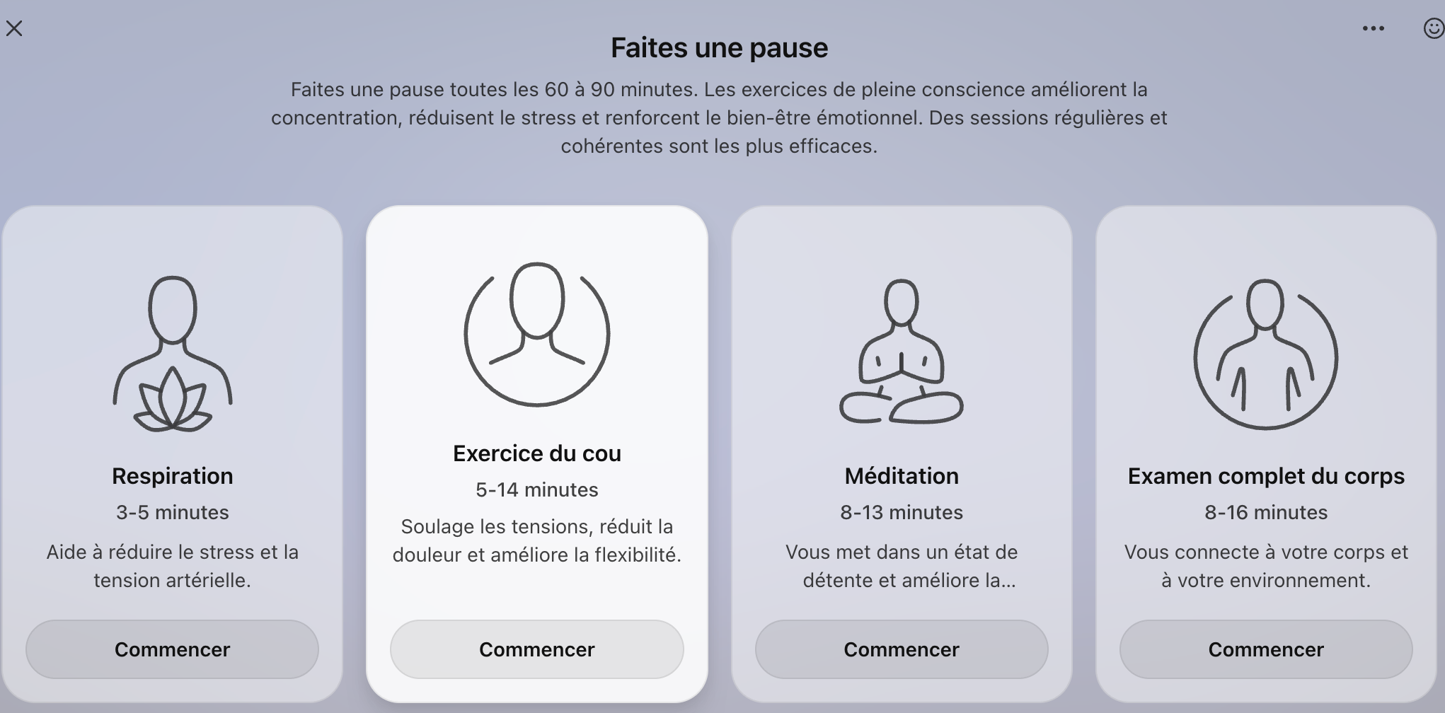 Le bouton Faites une pause. Tout d'abord, depuis les “…” en haut à droite, il est possible de demander à Opera Air d'effectuer automatiquement un rappel à l'utilisateur selon un timing choisi (par défaut 60 min). L'utilisateur devra alors choisir entre quatre types d'exercices : respiration, exercice du cou, méditation et examen complet du corps. La durée moyenne de chaque exercice est indiquée.