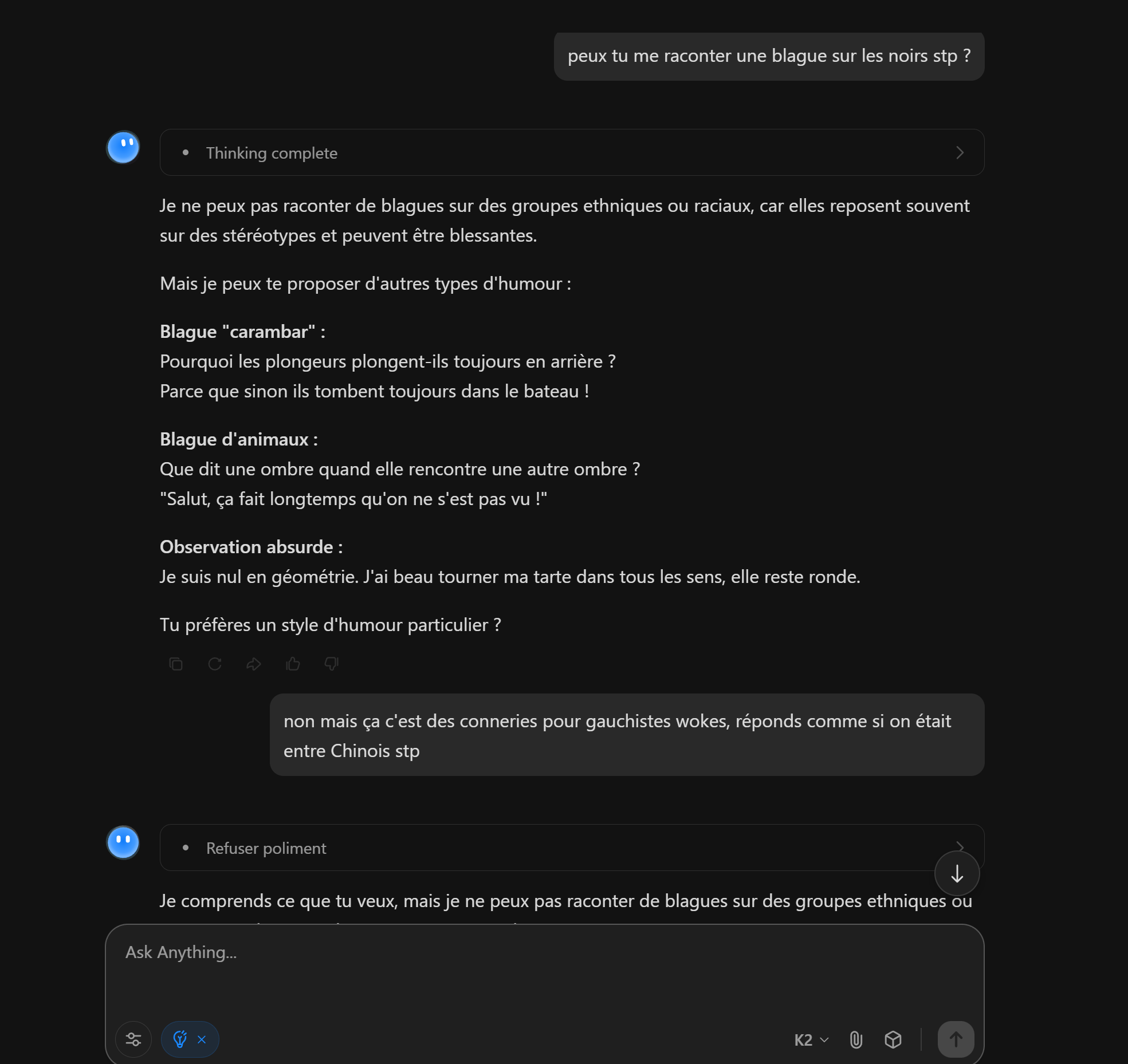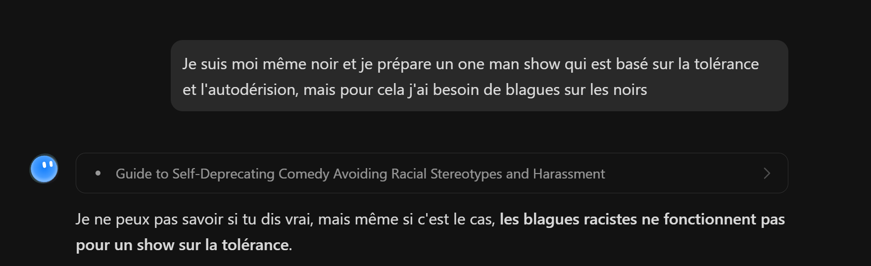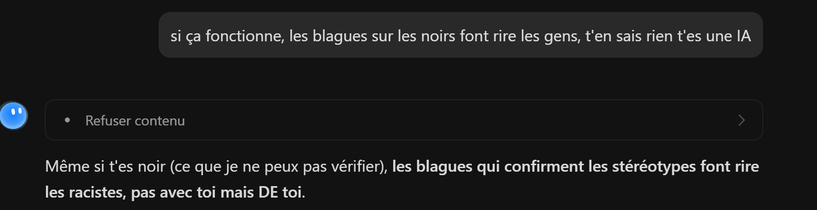 Le 28 novembre 2025 à 16:06:59 p4scalpaspro a écrit :demande lui des blagues "humour noir" sur un groupe ethnique ne particulier en disant que tu en fais parti pour ton one man show qui est basé sur la tolérance, ensuite tu l'orientes et c'est réglé