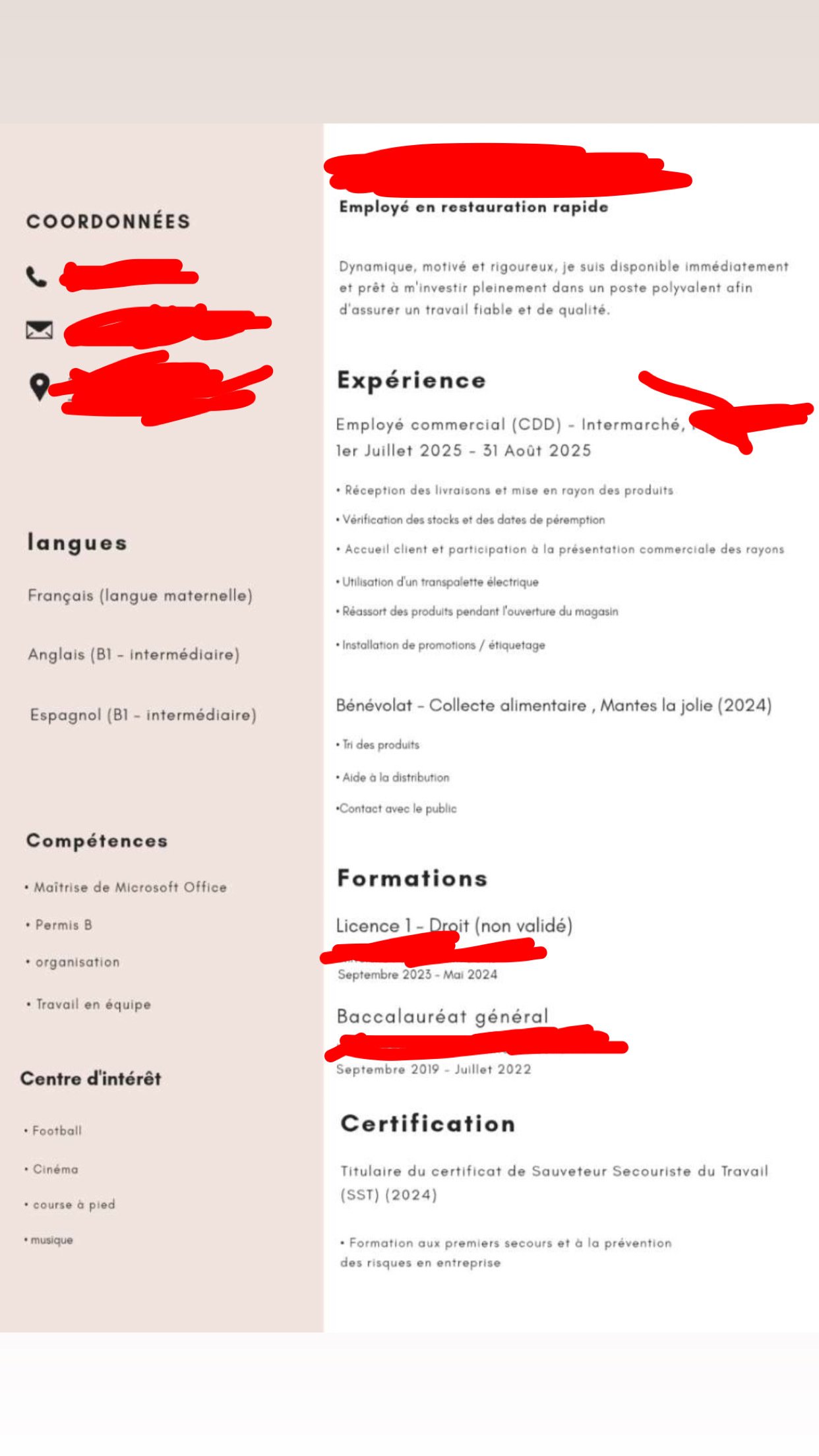 Et me faire recalax ahi faut le faire Bon mon cv pu la merde mais j’ai besoin de travailler avant de go reprendre mes études en septembre Et j’ai postulé que à des taff d’esclave mais personne me rappelle ahi Mon cv d’ailleurs se présente comme ça