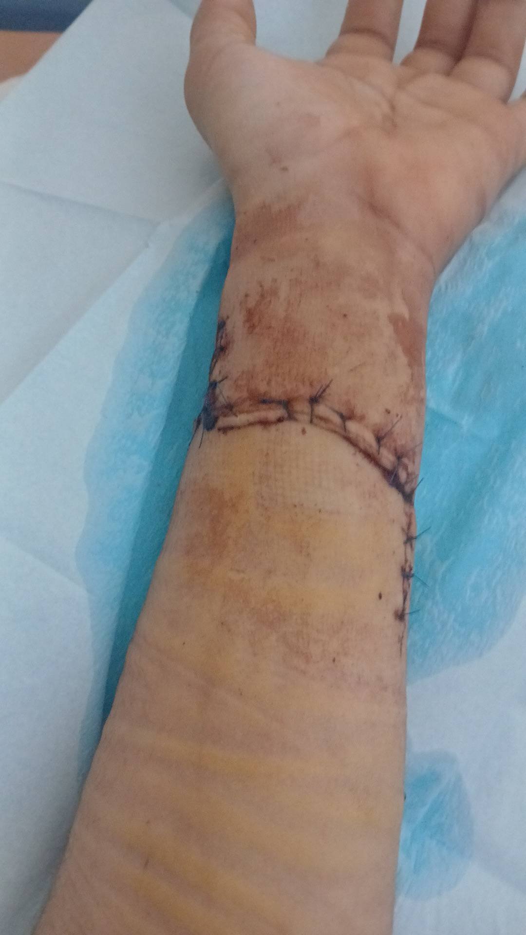 Donc il y a deux nerfs sectionnés au niveau du poignet face palmaire, ulnaire et l'autre je sais plus (artère et tendons aussi mais c'est pas important)