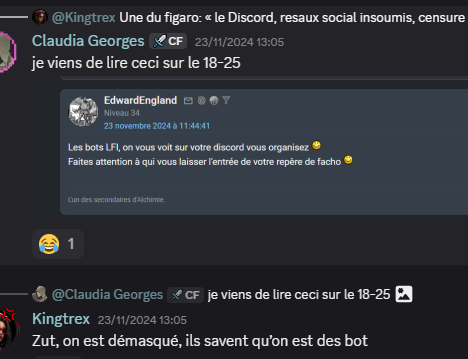Je suis LFISTE, le discord a été crée par des membres du forum et il existe des sub ou oui on s'organise pour savoir comment répondre aux racistes, ce n'est un secret pour personne que le discord crée par le 18-25 intervient sur le 18-25 mais de façon indépendante