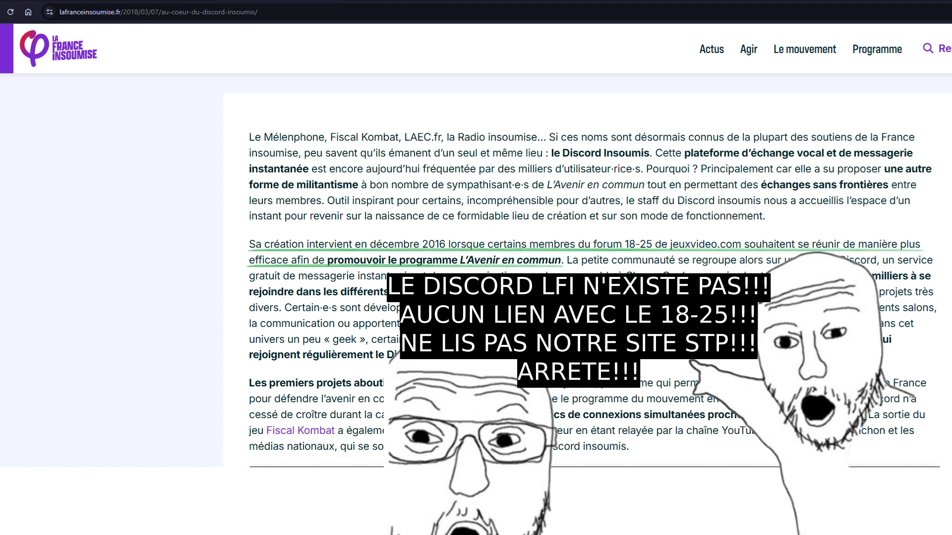 > > Also les gauchos : "Le Discord LFI a été fondé par des membres du 18-25 de JVC il y a 8 ans, mais il n'y a aucun lien. Le Discord n'existe de toutes façons pas"
