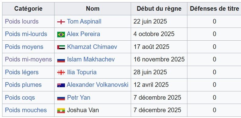 Que des nouveaux champions en 2025, enfin Topuria monte en LW, Makhachev monte en WW et Pereira récupère sa belt, donc eux étaient déjà champions dans leur catégorie respective, et sans compter les mecs qui ont déjà été champions avant comme Yan et Volk