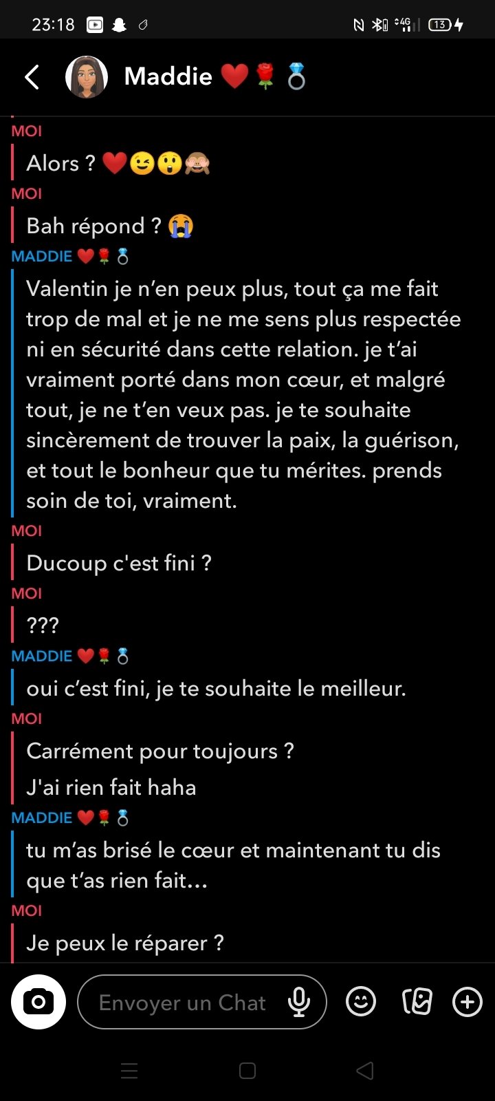 (Un peu pathétique mais j'étais défoncé elle voulait parler sérieusement et moi je lui répondais que je voulais mog devenir trie Adam et j'envoyai des photos d'Alain Delon de atesh salih..' j'ai fait le con mais je laime vraiment....