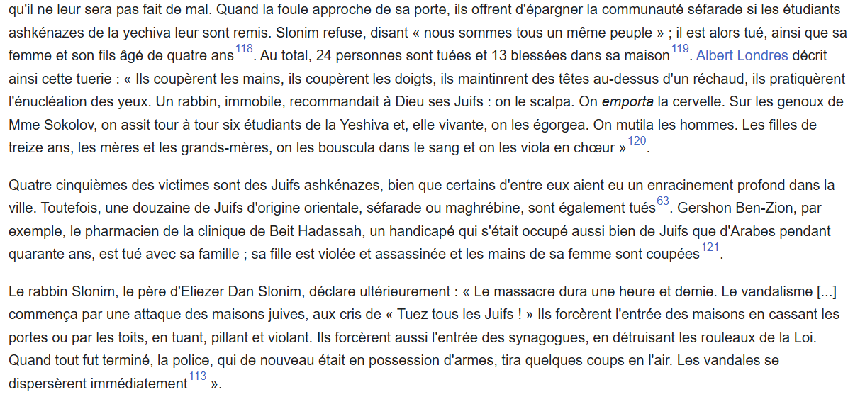 "Les massacres" c'est la guerre que la partie arabe est allée déclanchée en étant allée mutiler des civils, kidnapper des bébés et démembrer des jeunes filles ou c'est la dérouillée que les terroristes se sont pris de façon ultra méritax après ca ?