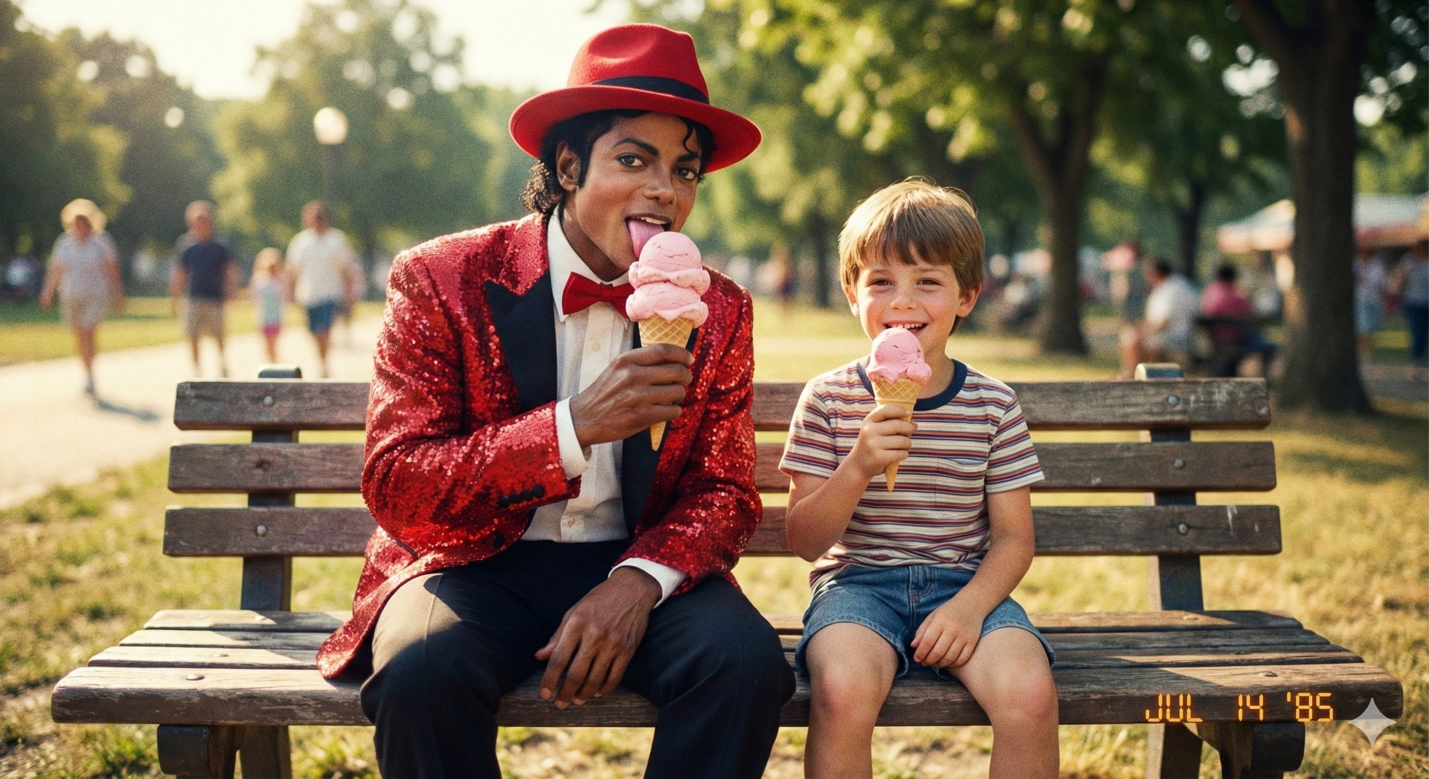 Le 07 décembre 2025 à 01:01:12 :Michael Jackson qui mange une glace deux boules fraise avec un petit garçon